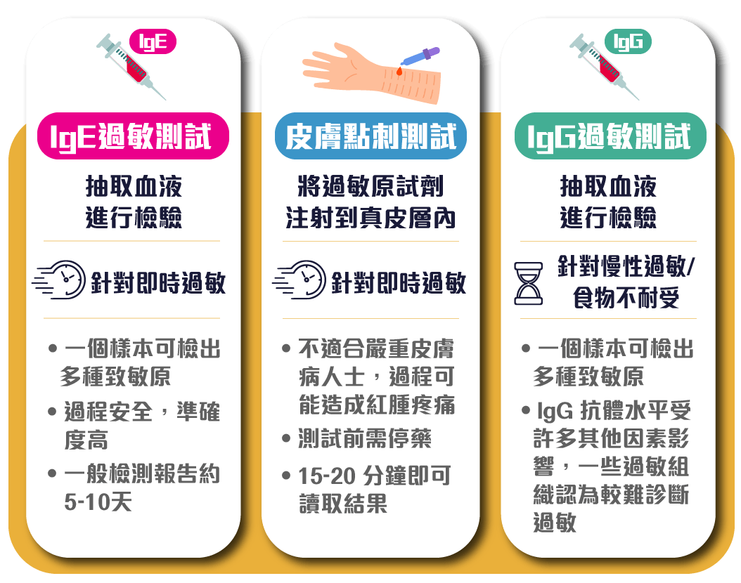 過敏測試可分為即時性(IgE、皮膚點刺)與延遲性(IgG)。IgE與皮膚點刺用於檢測數分鐘至1小時內發生的嚴重過敏,如蕁麻疹、呼吸困難,準確度高;IgG 則常用於檢測食物不耐受(慢性過敏),然而IgG 抗體水平會受許多其他因素影響,一些醫學組織通常不建議以此作為食物過敏診斷,一般只作參考用途。