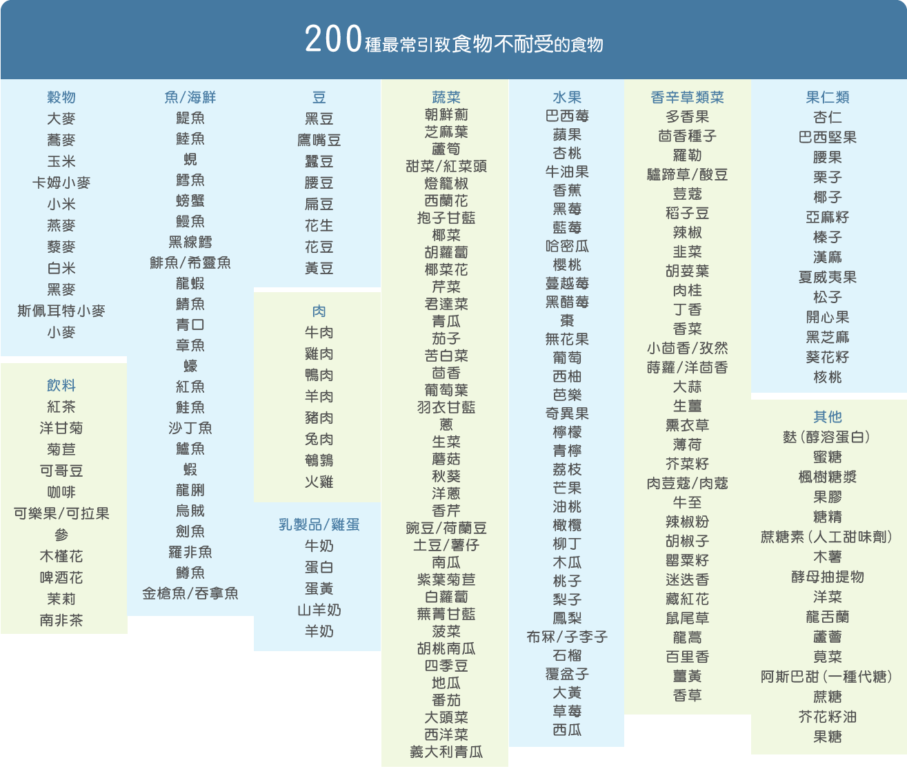 測試不耐受食物的種類包括穀物、豆、乳製品/雞蛋、肉、魚/海鮮、蔬菜、水果、果仁類、香辛草類菜、飲料及其他
