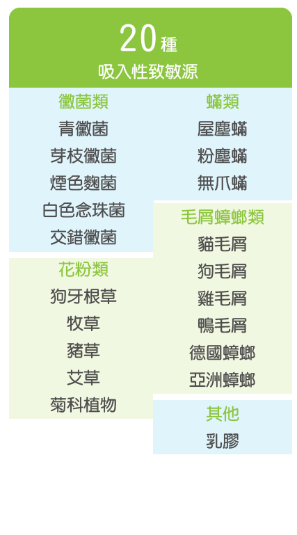 致敏原分為兩大類,包括食物致敏原及吸入性致敏原,常見的致敏原包括︰