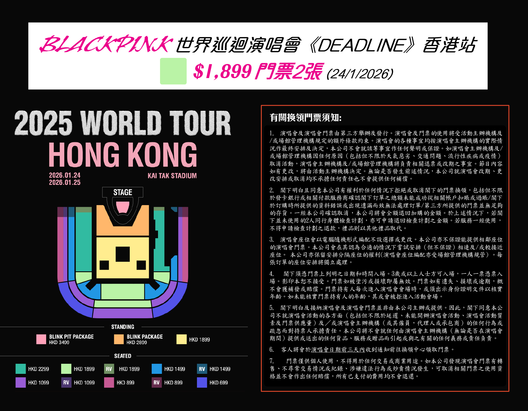 香港站$1,899門票 2張 (24/1/2026)門票會於演唱會日前三天內通知前往換領中心領取。門票換領須知
