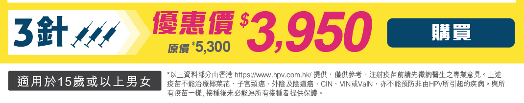 2. 客戶必須於推廣期內完成預約及付款,並須在2026年1月31日或之前接種第一針,方可享此優惠。 (身體檢查計劃以及餘下第二、第三針則須於在購買日起一年內在本診所完成。)