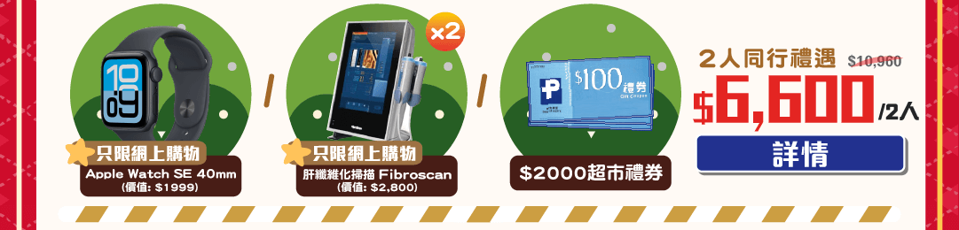 1. 優惠期至2025年12月29日,客戶必須於12月29日或之前完成預約,並於2026年3月29日或之前完成付款及服務方可享此優惠。2. 凡於此推廣期內,於Medtimes官網購買聖誕身體檢查計劃,付款時輸入指定優惠碼,全單即可減$100 或 額外送$100超市現金券(名額有限,送完即止)。(只限可於網上購買的服務,並需於網上交易時輸入優惠碼及成功付款。)*