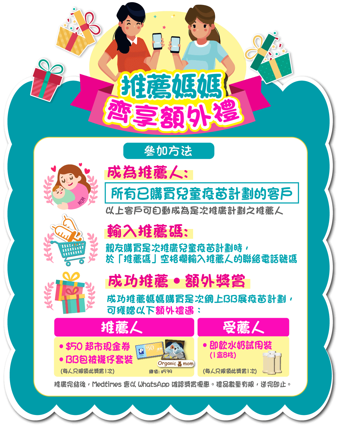- 購買是次推廣之兒童疫苗計劃 及 所有曾購買兒童疫苗計劃之舊客戶,均可成為此推廣計劃的推薦人;