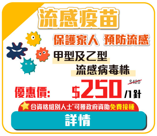 ‧ 流感疫苗可獲得免費接種,符合資助組別的香港居民可攜帶相關證明文件,以資助該疫苗接種費用。