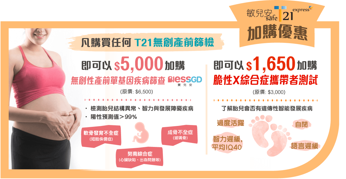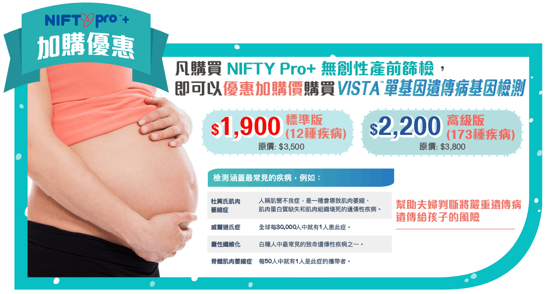 4. 所有加購項目 (包括:VISTA 單基因遺傳病基因檢測 / 脆性X綜合症攜帶者檢測 / BlessGD 寶兒安無創性產前單基因疾病篩查) 須於進行無創產前檢測時一同使用及同日抽血作檢驗。VISTA 單基因遺傳病基因檢測報告需時約30個工作天;脆性X綜合症攜帶者檢測報告需時約7個工作天;BlessGD 寶兒安無創性產前單基因疾病篩查報告需時約21個工作天。每位NIFTY Pro+ 無創性胎兒染色體異常產前檢測之檢測者只可加購一項 VISTA 單基因遺傳病基因檢測。
