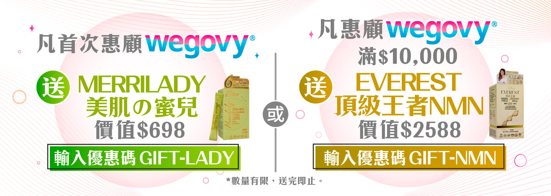 3. 凡於此推廣期內,於Medtimes官網首次惠顧Wegovy或購買Wegovy滿HK$10,000,付款時輸入優惠碼,可額外獲贈日本美康萊 MERRILADY美肌の蜜兒 或 EVEREST 頂級王者 NMN。禮品會於進推廣期完結後15天內,收到領取通知。禮品數量有限,送完即止。(只限於網上購買的服務,並需於網上交易時輸入優惠碼及成功付款,如客人並不符合領賞資格,將會自動取消此優惠資格而不另作通知。)*