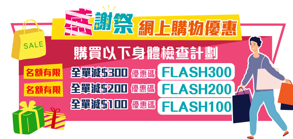 - 優惠期至2025年11月30日,客戶必須於11月30日或之前完成預約及付款,並於2026年1月31日或之前完成檢查服務或第一針疫苗注射方可享此優惠。- 凡於此推廣期內,於Medtimes 官網購物感謝祭推廣健康檢查計劃時輸入指定優惠碼即可享指定折扣。(只限網上購買,並需於網上交易時輸入優惠碼及成功付款。)