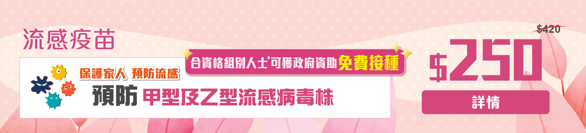 ‧ 流感疫苗可獲得免費接種,符合資助組別的香港居民可攜帶相關證明文件,以資助該疫苗接種費用。