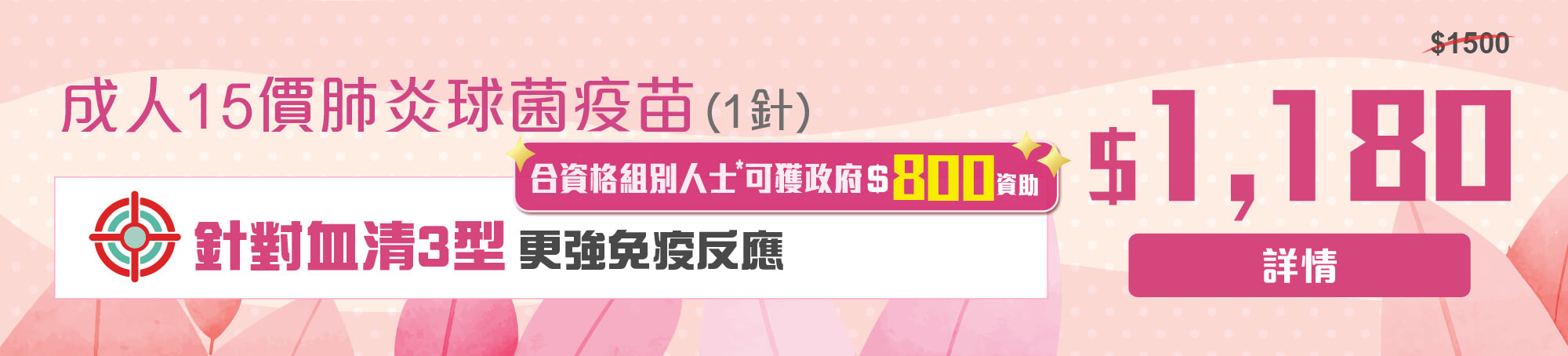 ‧ 15價肺炎球菌疫苗資助額為 $800 ,符合資助組別的香港居民可攜帶相關證明文件,以資助該疫苗接種費用。