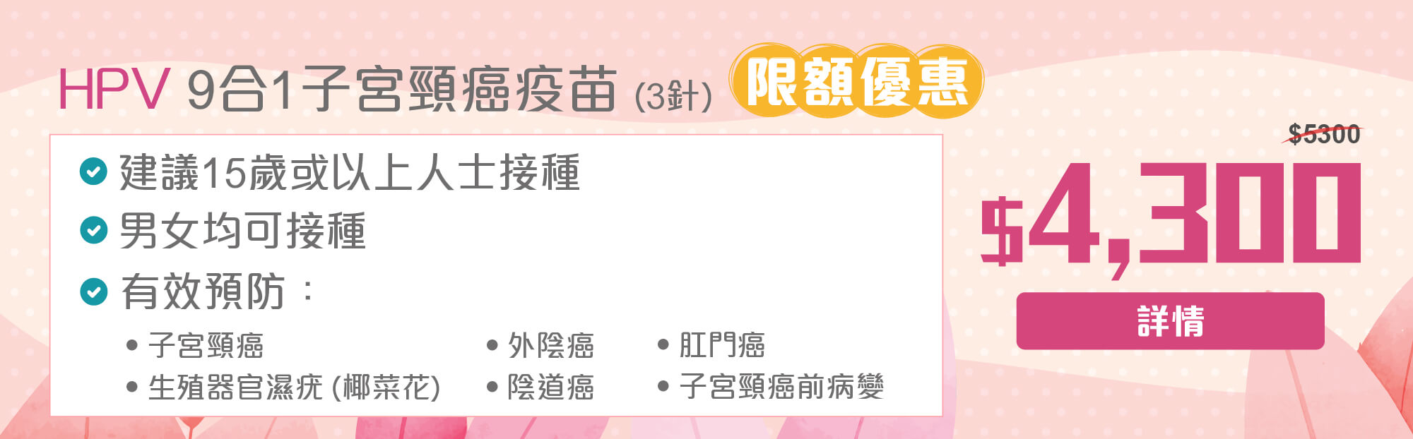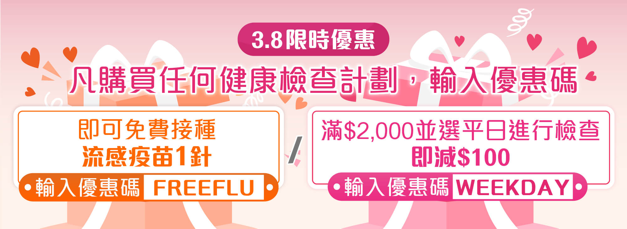 1. 優惠期至2026年3月19日,客戶必須於3月19日或之前完成預約,並於2026年5月19日或之前完成付款及服務 (或首針疫苗注射) 方可享此優惠,逾期無效。