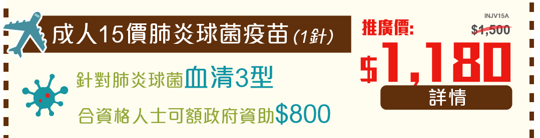 ‧ 15價肺炎球菌疫苗資助額為 $800 ,符合資助組別的香港居民可攜帶相關證明文件,以資助該疫苗接種費用。