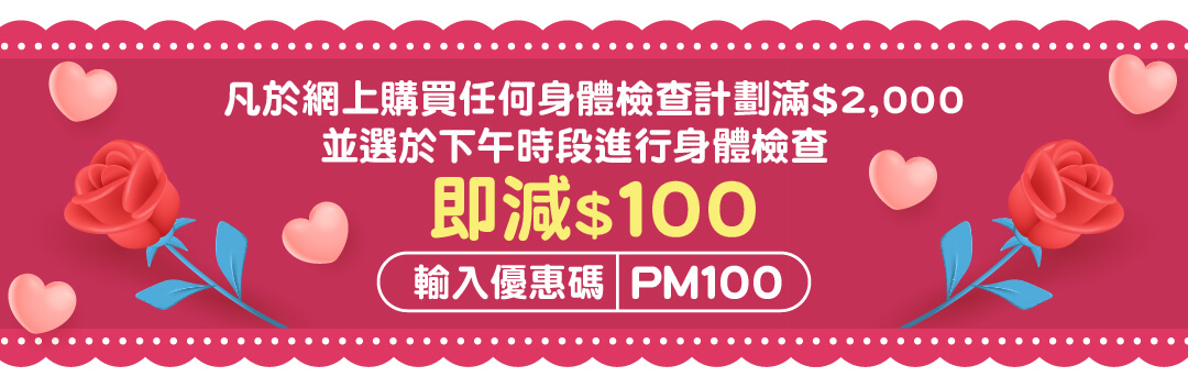 - 凡於Medtimes官網購買任何身體檢查計劃滿HK2,000並選於下午時段進行身體檢查,付款時輸入優惠碼即減$100。(只限於網上購買的服務,並需於網上交易時輸入優惠碼及成功付款,如到診客人並非下午時段進行身體檢查,將不可享此優惠折扣。)*
