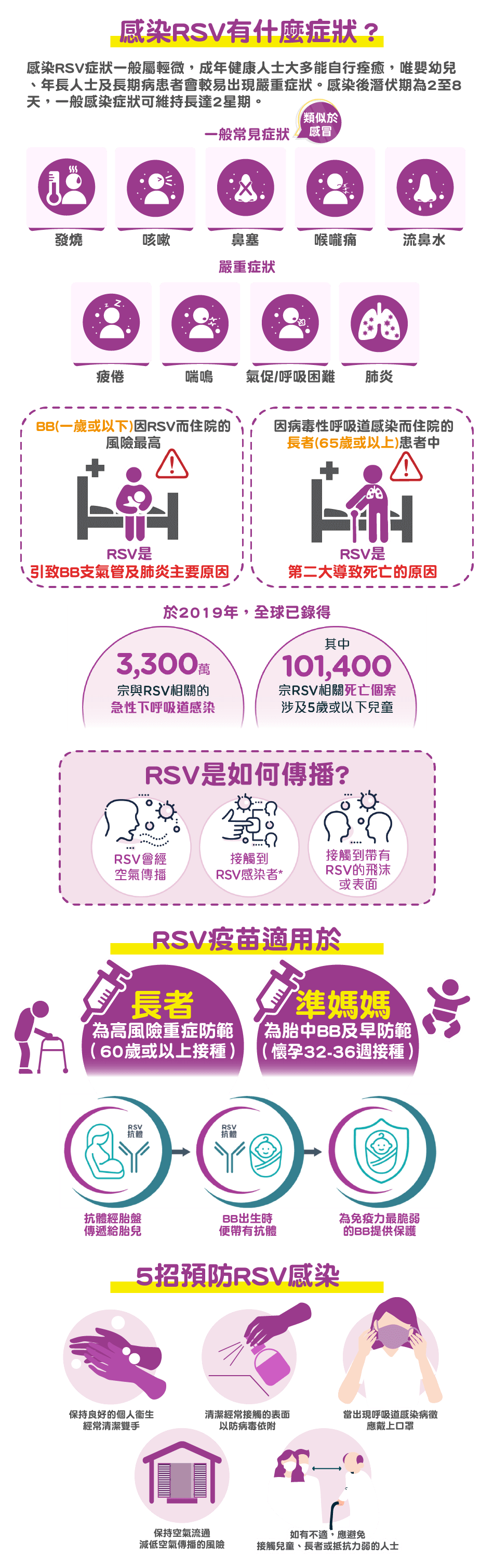RSV呼吸道合胞病毒(Respiratory Syncytical Virus)是一種常見且高度傳染性的呼吸道病毒,可引致呼吸道疾病,例如氣管、肺部及中耳的感染。任何年齡都可能感染RSV,但是對嬰幼兒、老年人或長期病患者會容易發展為重症。